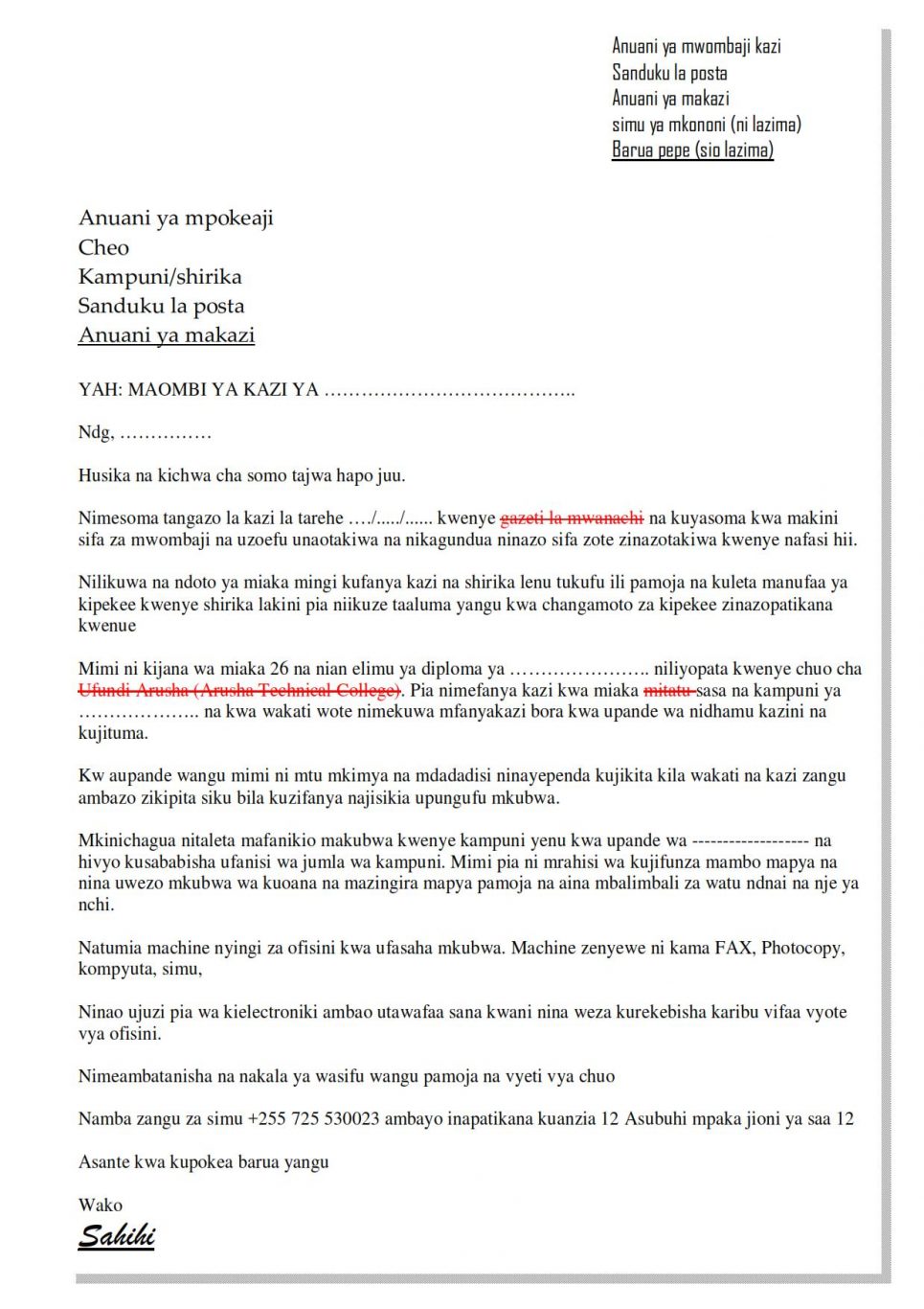 Barua ya maombi ya kazi iwe na sura hii